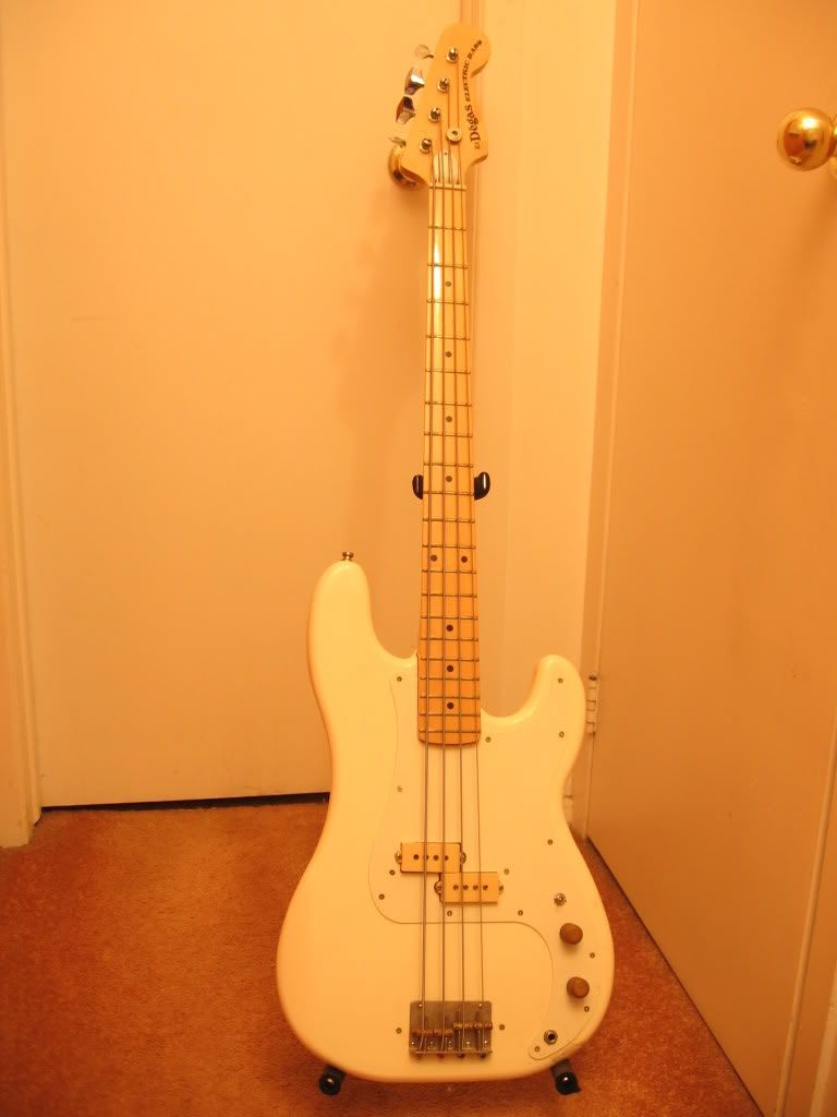 I'm actually surprised how many of these I've seen (and almost bought over the years) ... a Les Paul ... a koa Explorer that I'm still kicking myself for not buying ... a P-bass with truss rod adjustment at the body end ... and this. My P-bass. The truss rod is at the head end, small tuners, MIJ, stock DiMarzio pickup with phase switch, plywood body. Orignially 3-ply b/w/b pickguard with chrome knobs and screws, now single ply white pickguard with aged brass knobs and brass screws. Everything else stock ... had the frets dressed once after a brief affair with Rotosound strings. Sounds more Rickenbacker-ish than Fender-ish, and weighs a TON. Has to be at least 12 or 13 pounds. I had a strap button pull out and dropping the bass onto a pedal. Significant crack in the body repaired by handfuls of glue and some white paint. I think I bought this new in '79, '80 at the latest. I still use it frequently.